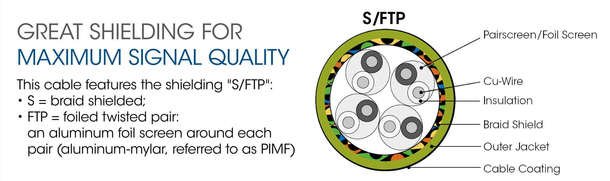 - S/FTP : S = toronné : tresse de cuivre étamé ; FTP = paire torsadée écrantée : blindage par feuille d'aluminium autour de chaque paire (aluminium-mylar, également appelé PIMF)